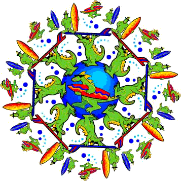 This is sort of surfing dinosaurs meet mandala 60's reality. If you stare into the center and chant "dino-sauro-slam-the-lip" you will get in touch with your inner surfasaurus and ward off stink-eye.